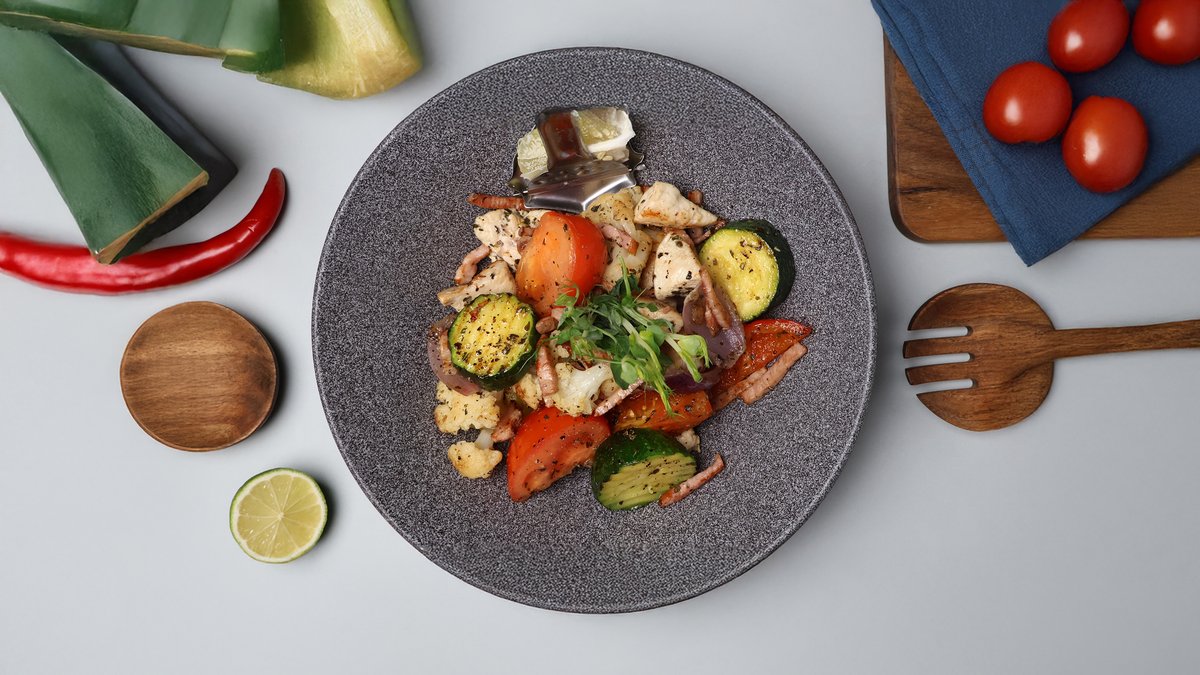 (vistas fileja, cukini, puķkāposts, sīpols,paprika, tomāti, žāvēts cūkgaļas šķiņķis, baziliks)
