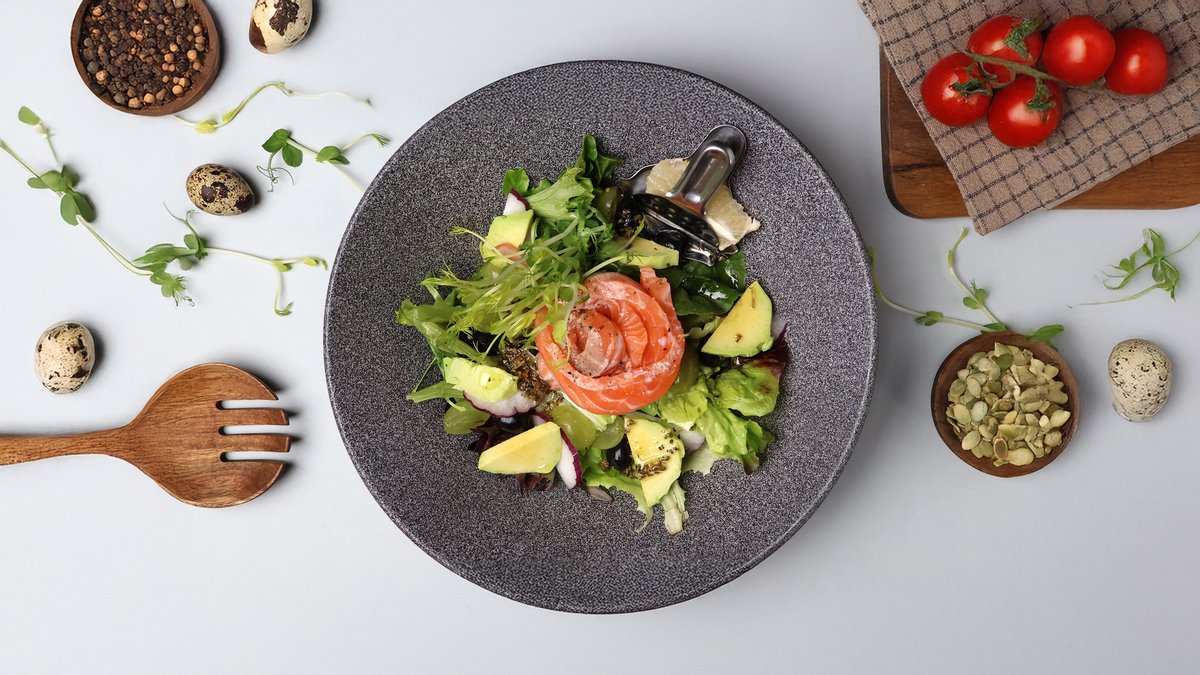 (salātlapas,mazsālīts lasis,sīpoli,vīnogas, avokado,olīvas,citronu - bazilika eļļas mērce)
