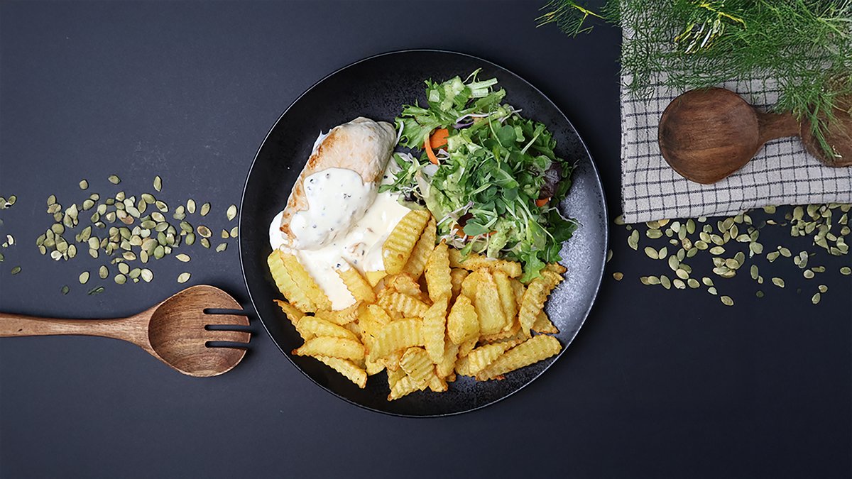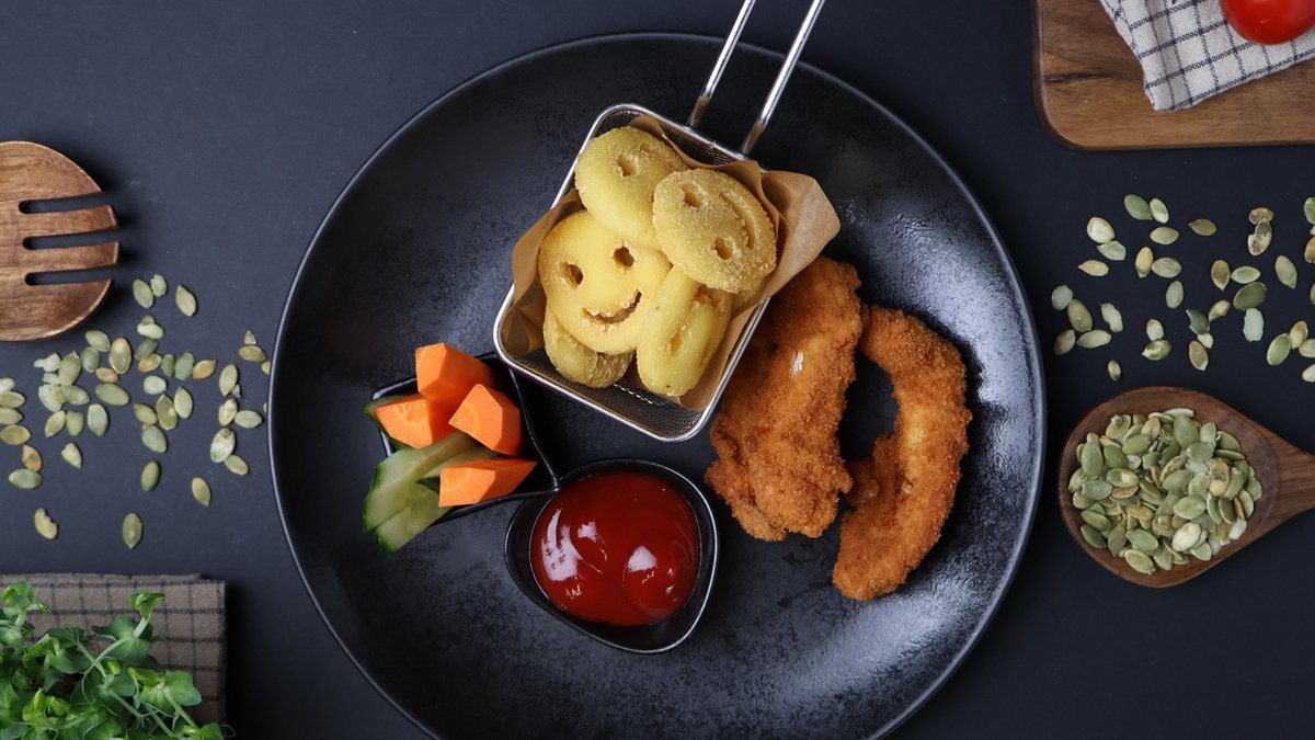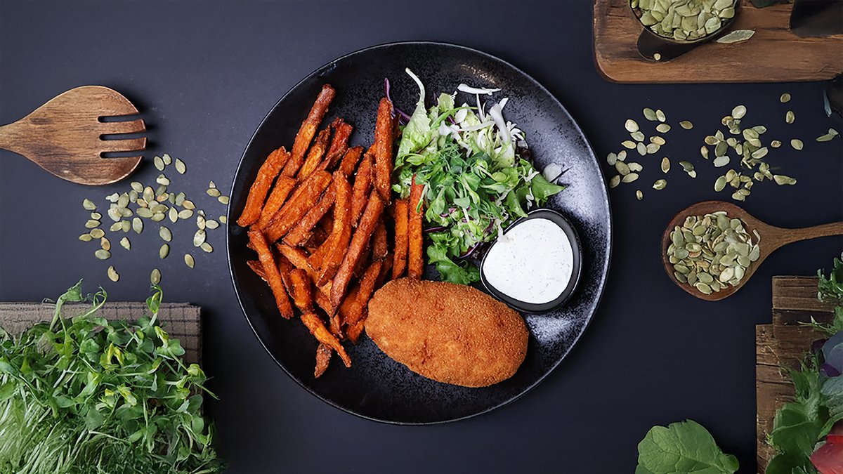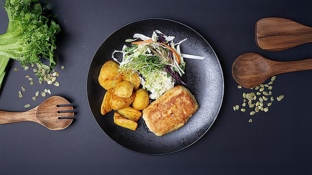 Vistas filejas nageti rīvmaizes panējumā, kartupeļu smaidiņi, gurķi, burkāni, sezama sēklas