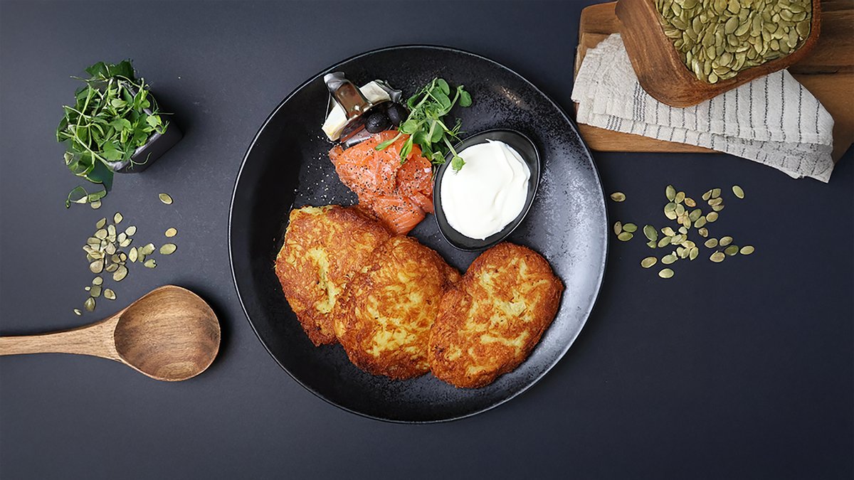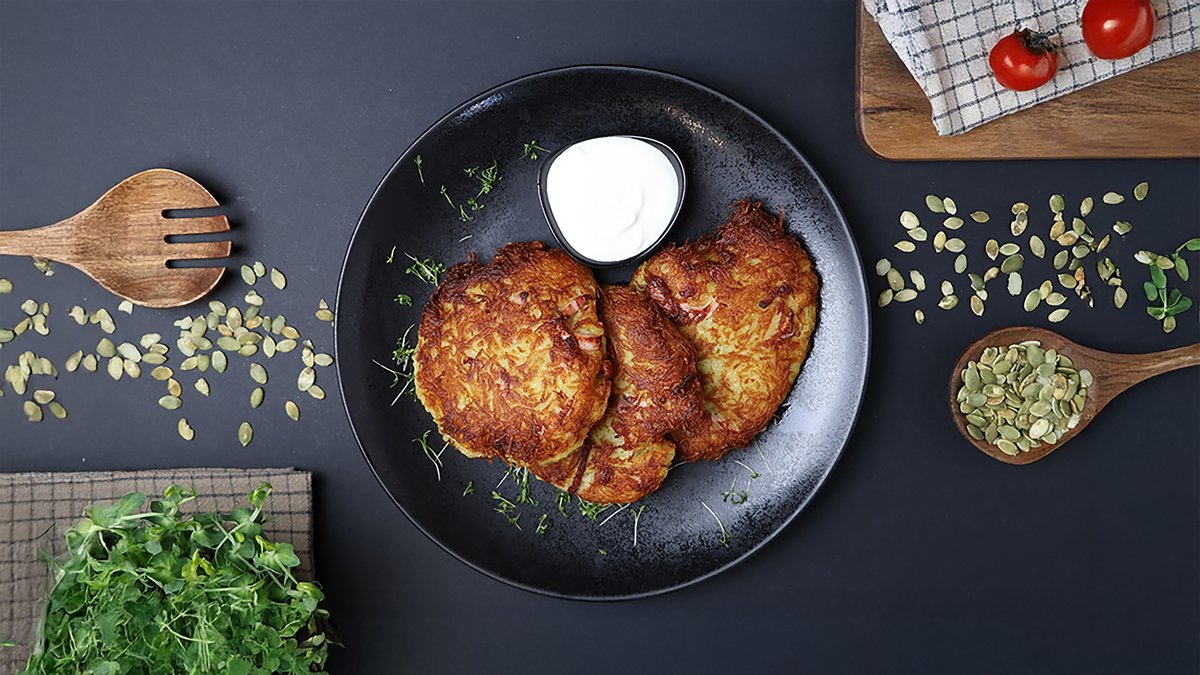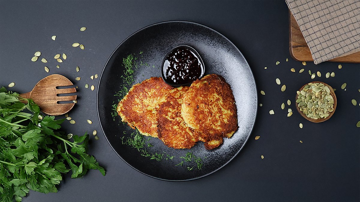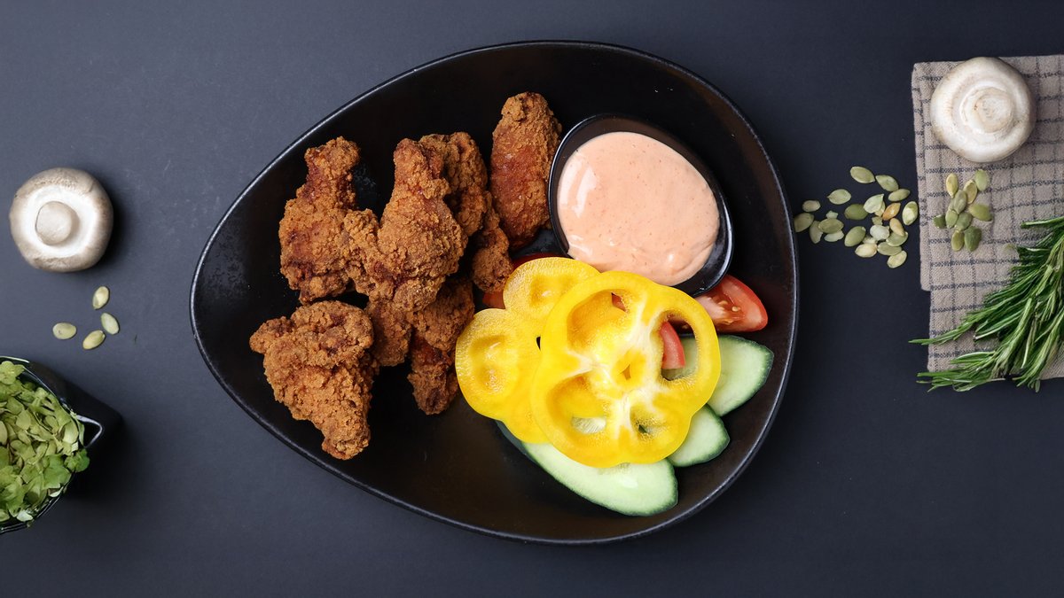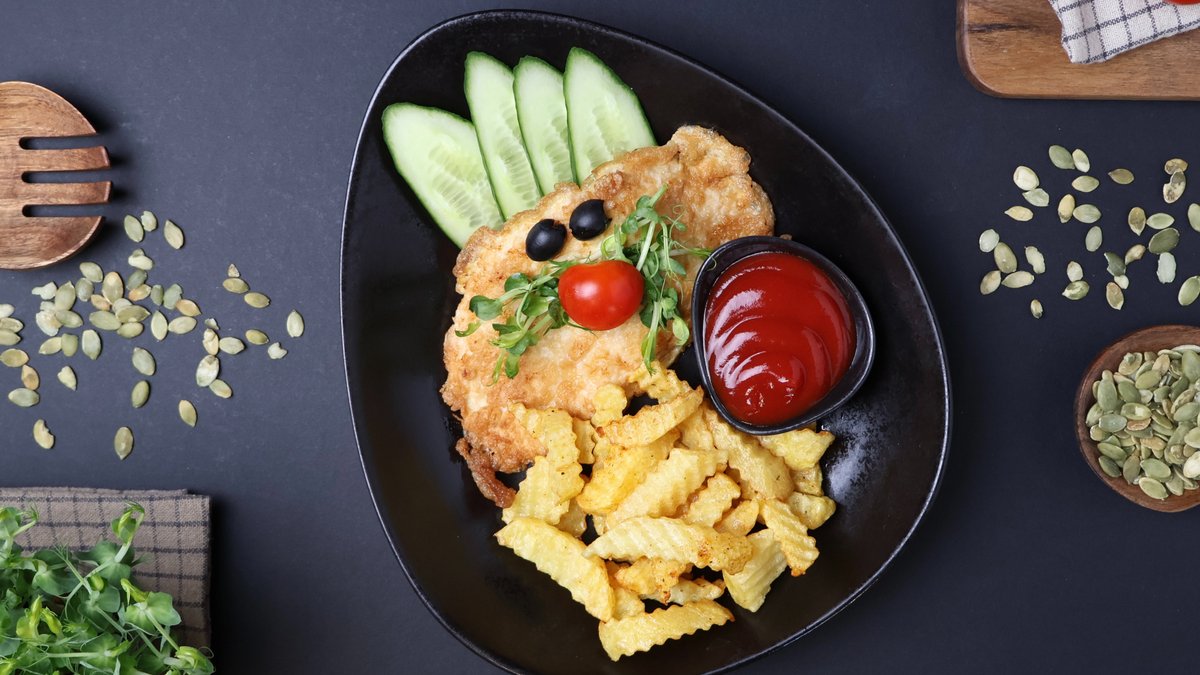 Vistas filejas nageti rīvmaizes panējumā, kartupeļu smaidiņi, gurķi, burkāni, sezama sēklas
