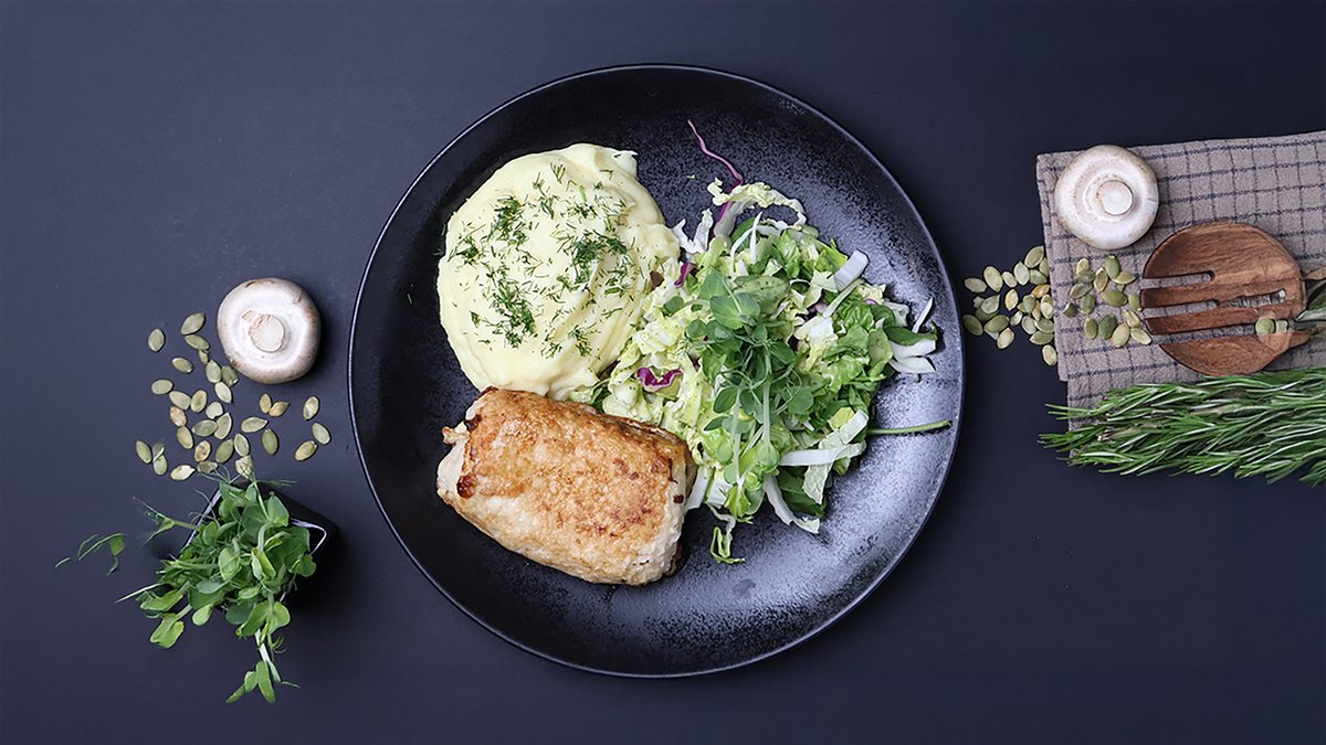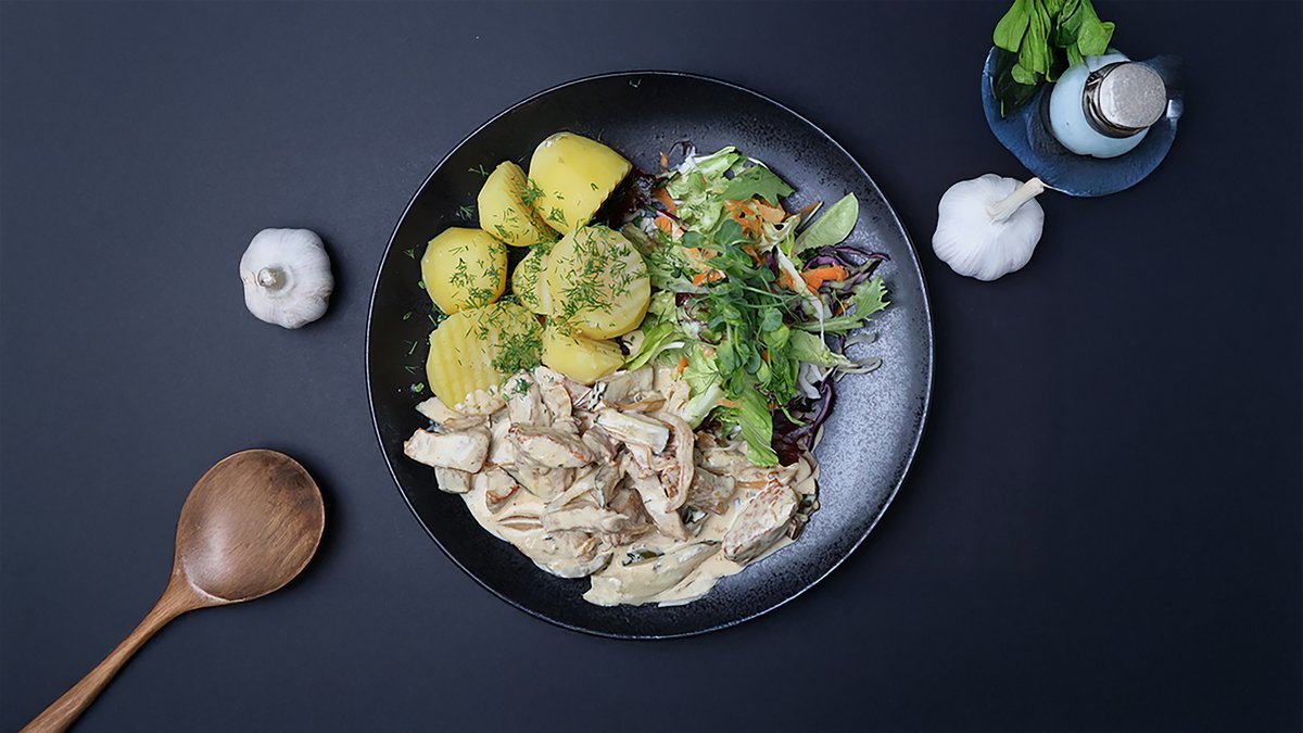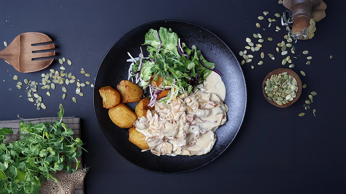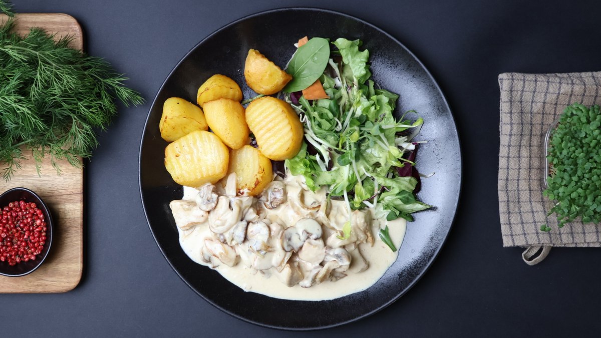 (vistas fileja, saldais krējums, skābais krējums, šampinjoni, sīpoli, garšvielas)