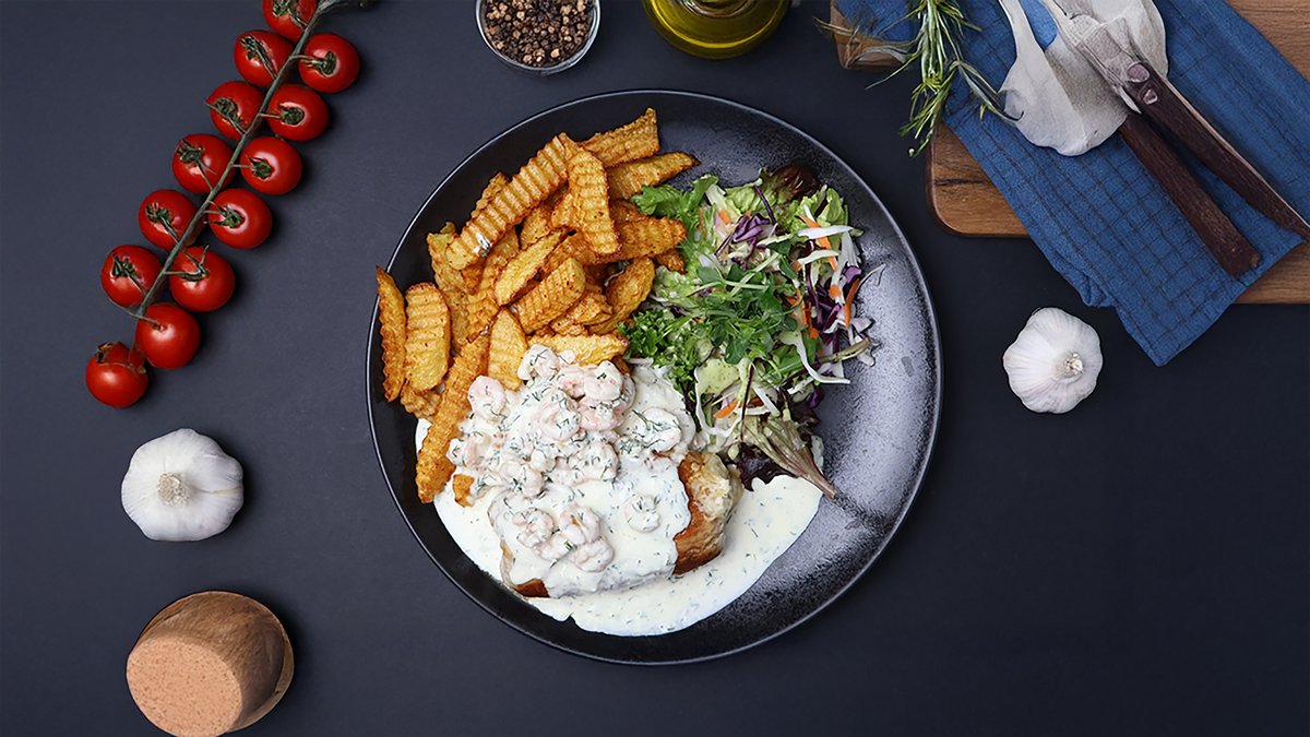 (cūkgaļas karbonāde, garneles, siers, saldais krējums, skābais krējums, mārrutki, dilles, garšvielas)