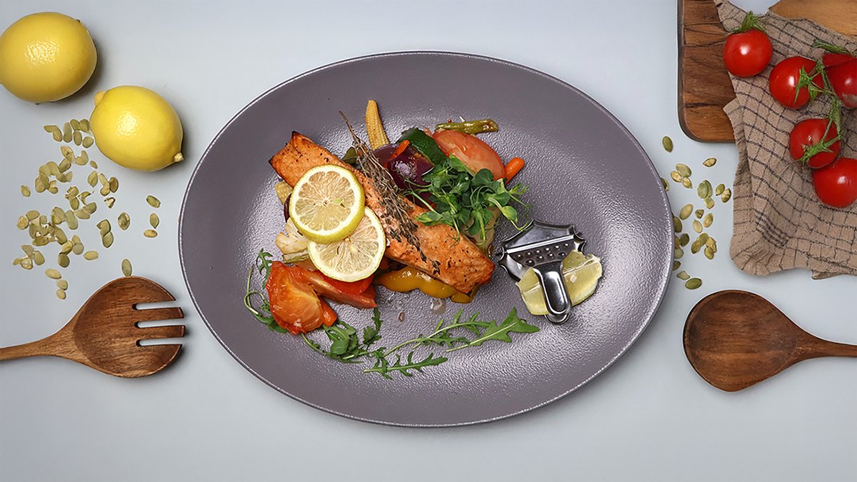 (laša fileja,sojas mērce, puķkāposti, cukini, paprika, tomāti, sarkanais sīpols, zaļās pupiņas, burkāni, saldā čili mērce, garšvielas) (Alergēni ēdienkartē:Graudi - a , vēžveidīgie – b, olas – c, zivis – d , rieksti- e, piens, piena produkti- f , selerijas – g, sinepes – h, soja – i, sezams - j, sēra dioksīds un sulfīti – k,lupīna- l) Dažādi otrie ēdieni / Various second courses/