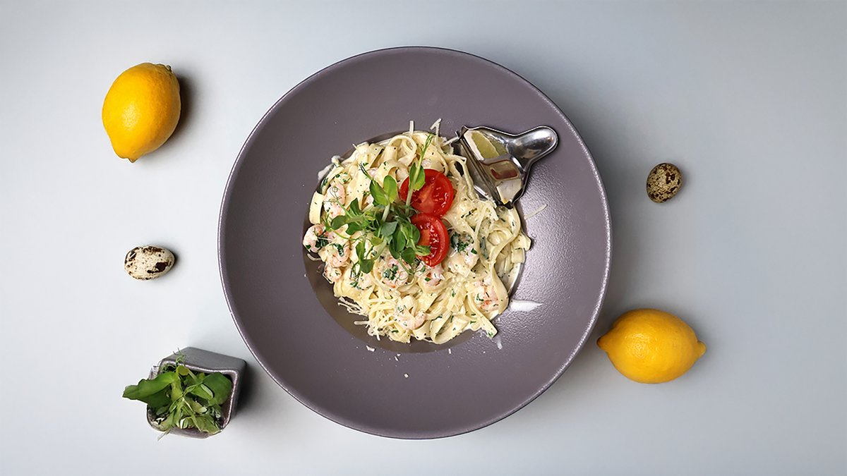(pasta, garneles, sviests, dilles, pētersīļi, ķiploks, saldais krējums, parmezāna