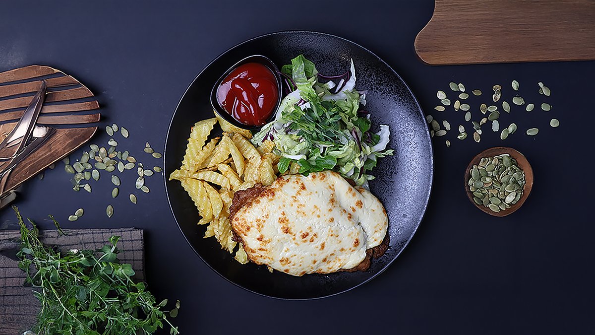 (cūkgaļas karbonāde, sinepes, marinēts gurķis, sīpoli, siers, olas, milti, garšvielas) Pork chop “Lauku gaumē” - pork chop, mustard, pickle, onion, cheese, eggs,