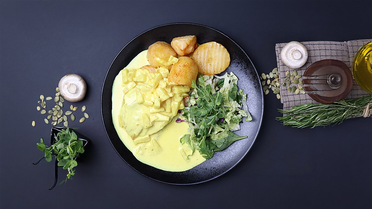 (Vistas fileja, saldais krējums, skābais krējums, konservēti ananasi, karijs, garšvielas)