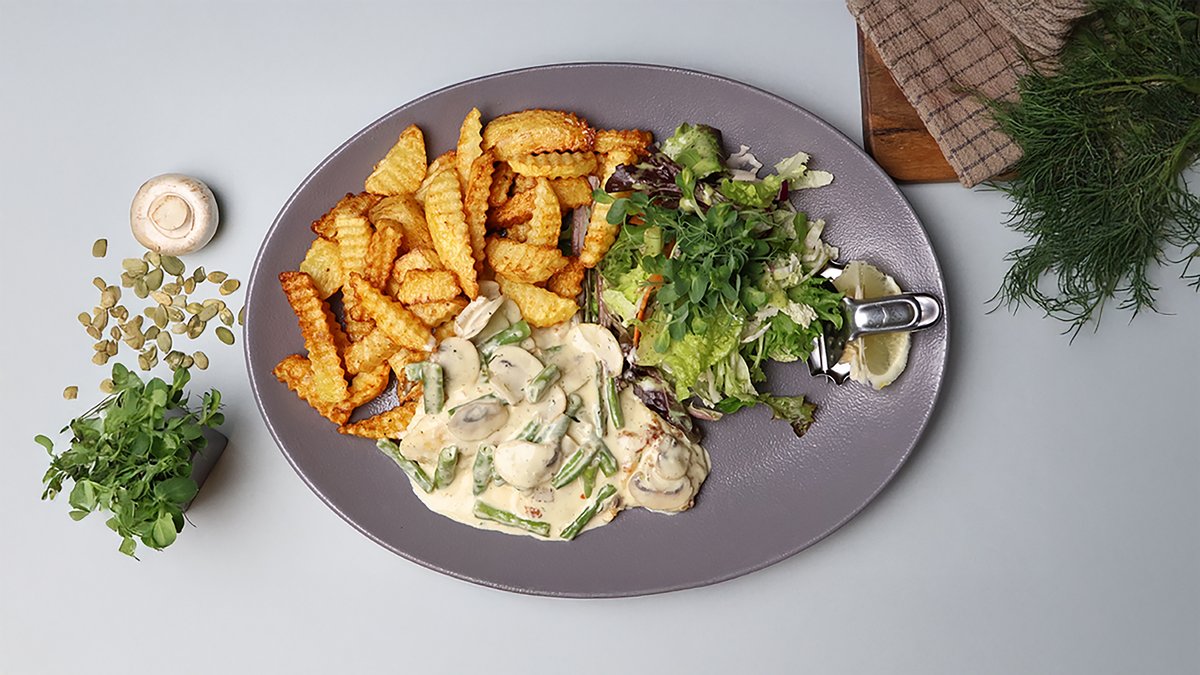 (zandarta fileja, milti, olas, saldais krējums, skābais krējums, šampinjoni, zaļās pupiņas, garšvielas)