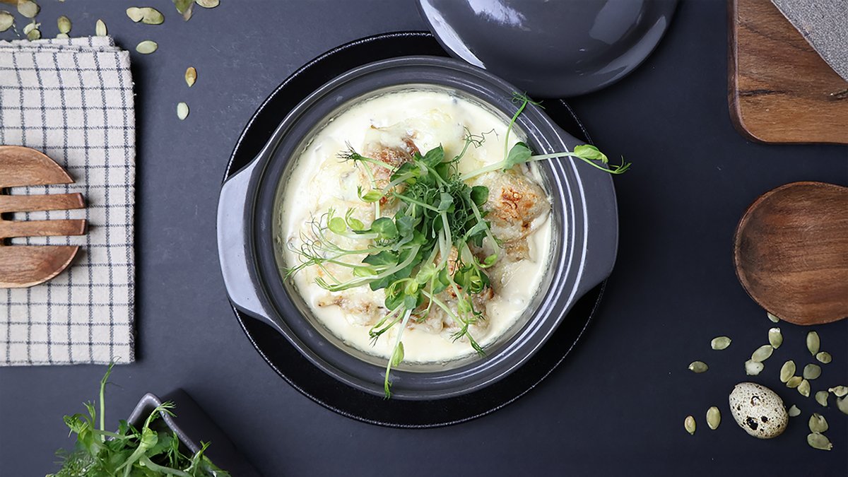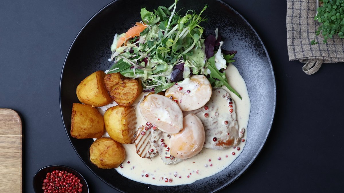 (cūkgaļas fileja, saldais krējums, skābais krējums, cūkgaļas šķiņķis, sīpols, baravikas, garšvielas)