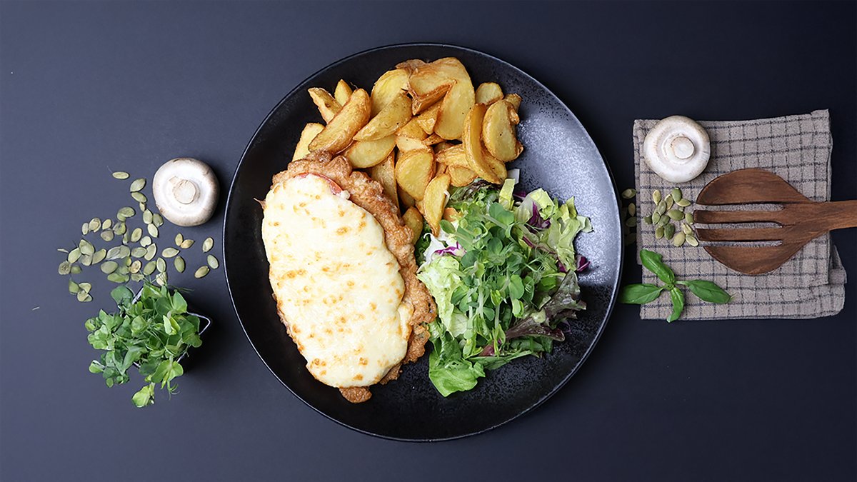 (cūkgaļas karbonāde, tomāts, siers, majonēze, olas, milti, garšvielas)