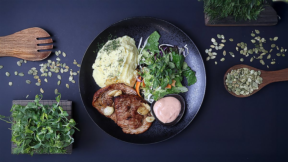 (cūkgaļas fileja, eļļa, baltvīns, ķiploks, garšvielas, steika mērce)