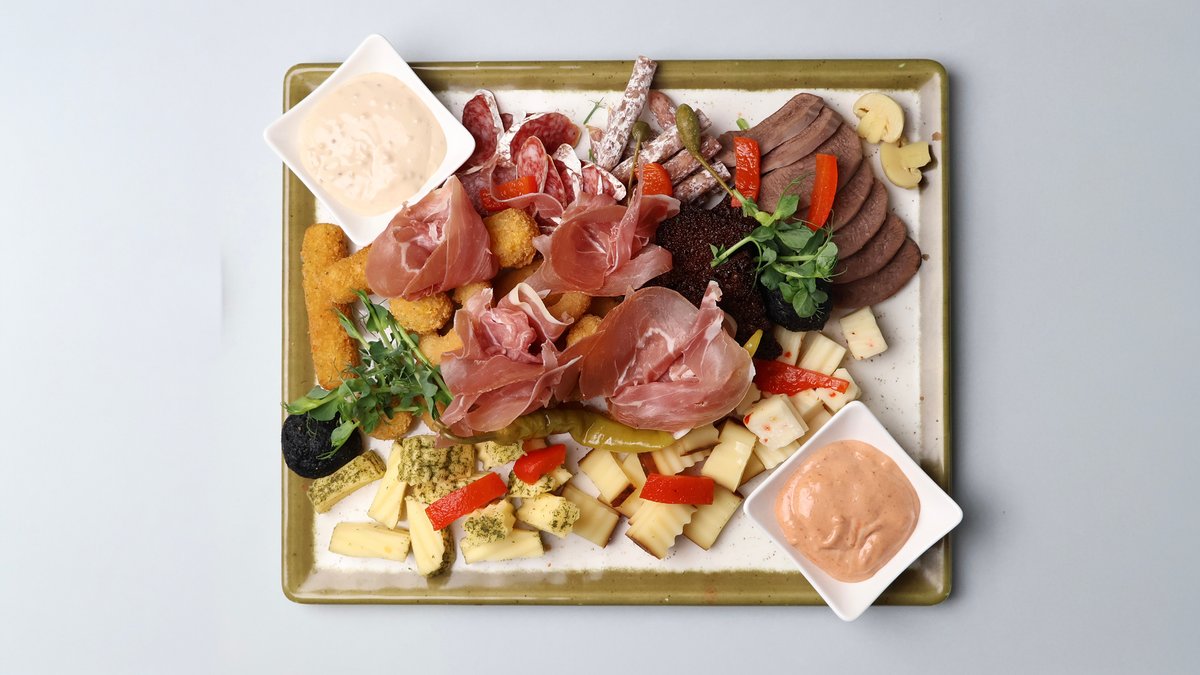 vārīta mēle, siers, žāvēta gaļa, cigārdesiņas, ķiploku grauzdiņi, sīpolu gredzeni mīklā, fritētas siera uzkodas, marinēti gurķīši,marinēta paprika, marinēti šampinjoni, steika mērce, sinepju mērce