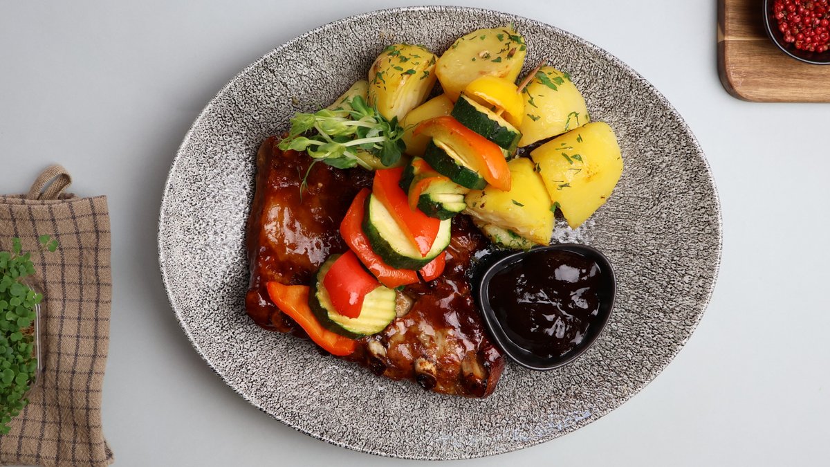 BBQ ribiņas ar krāsnī apceptiem kartupeļiem