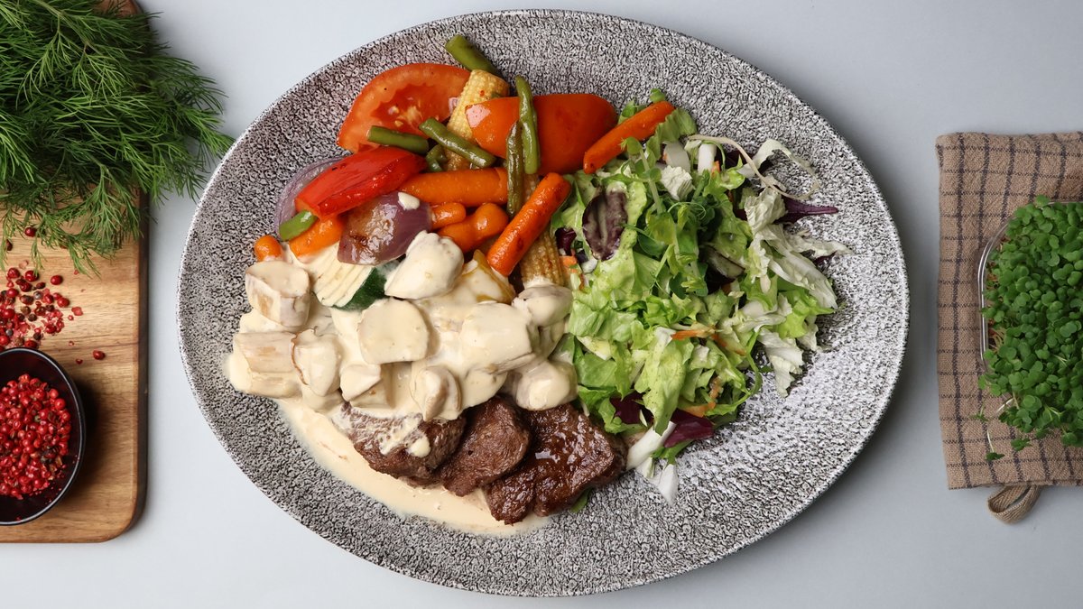 (liellopa fileja, saldais krējums, skābais krējums, sīpoli, paprika, kartupeļi, tomāti, garšvielas)