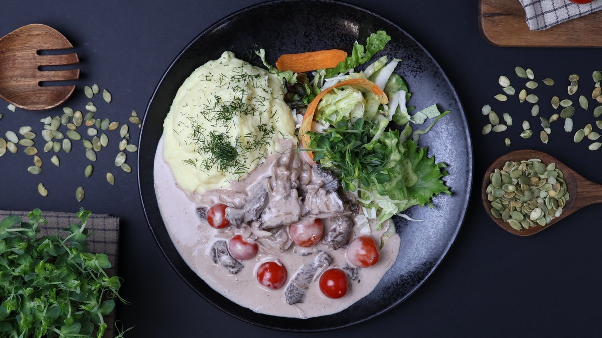 (liellopa fileja, saldais krējums, skābais krējums, baravikas, garšvielas)