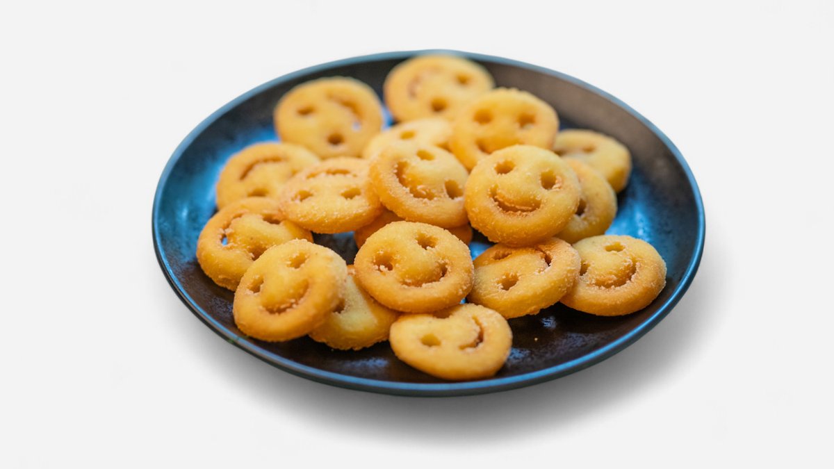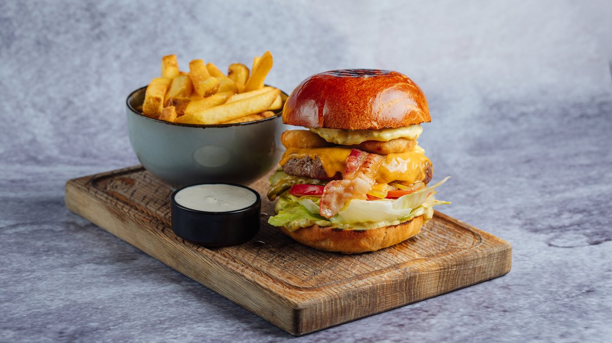 Burgeru mērce, ledus salāti, tomāts, marinēts gurķis, sīpols, sīpolu gredzeni, sīpolu marmelāde + frī kartupeļi ar ķiploku mērci