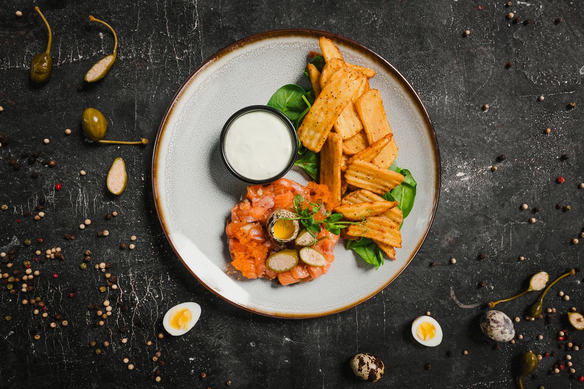Laša tartars ar frī kartupeļiem un avokado-laima mērci
