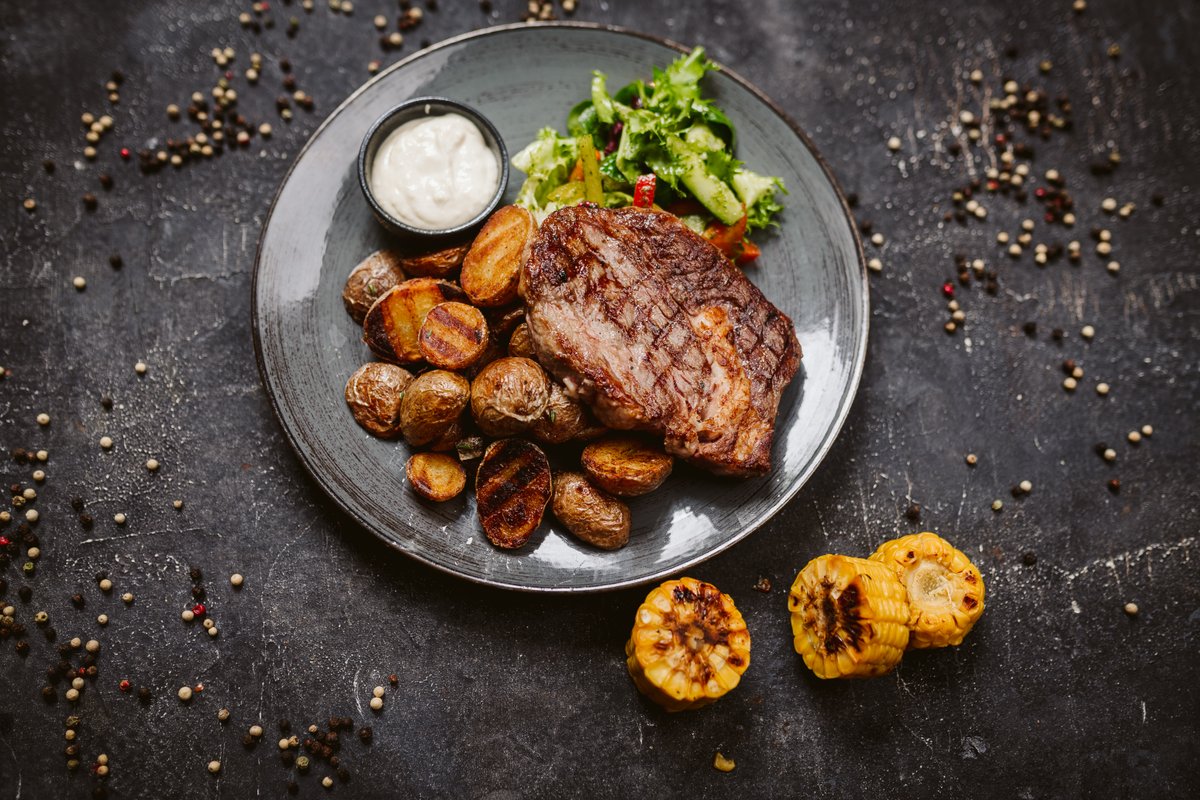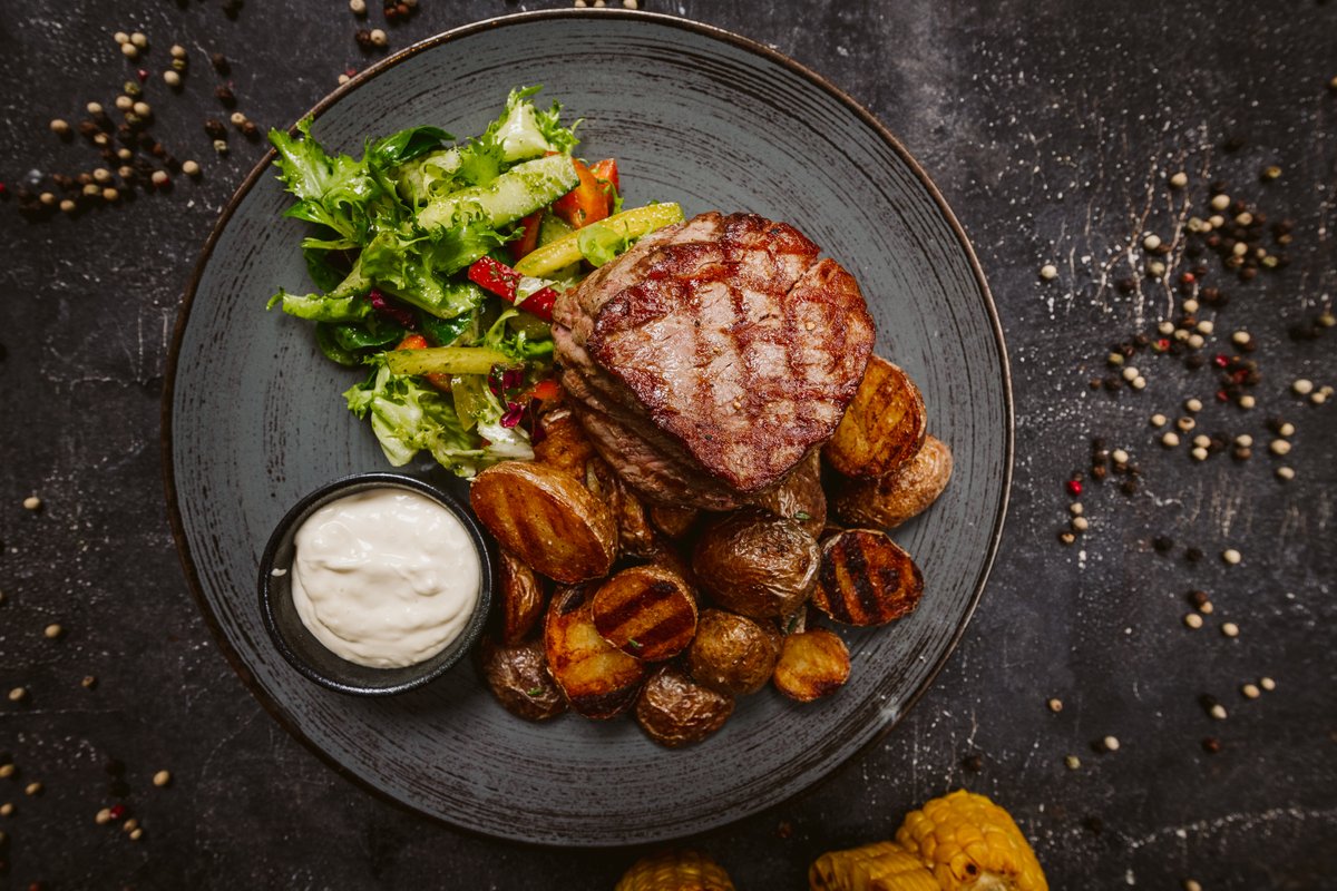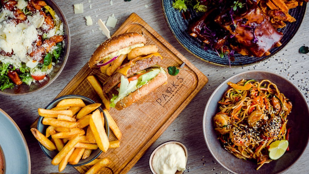 Liellopa gaļas burgers "PARKS klasika" ar frī kartupeļiem un ķiploku mērci