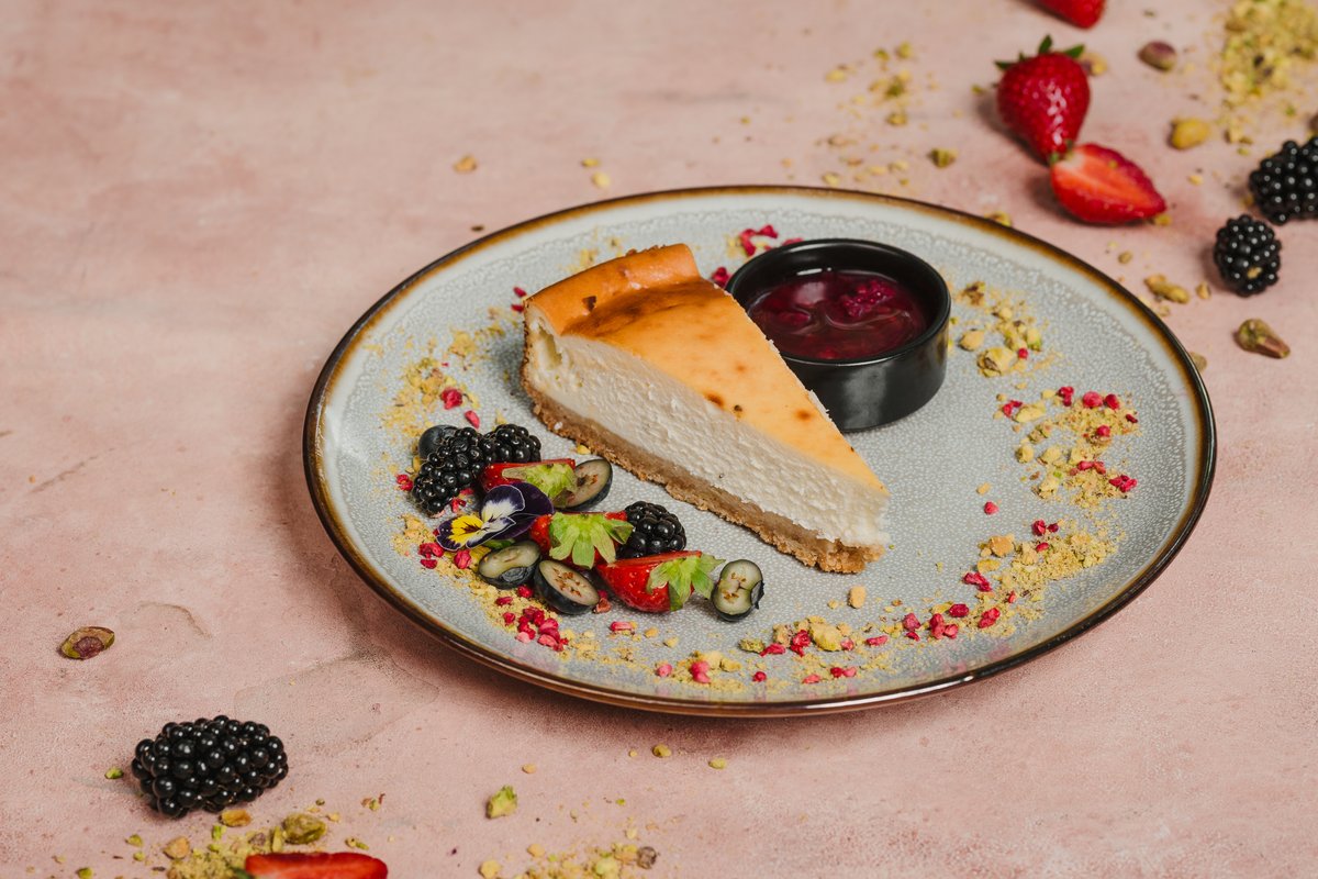 PISTĀCIJU SIERA KŪKA ar granātābolu mērci un svaigām ogām