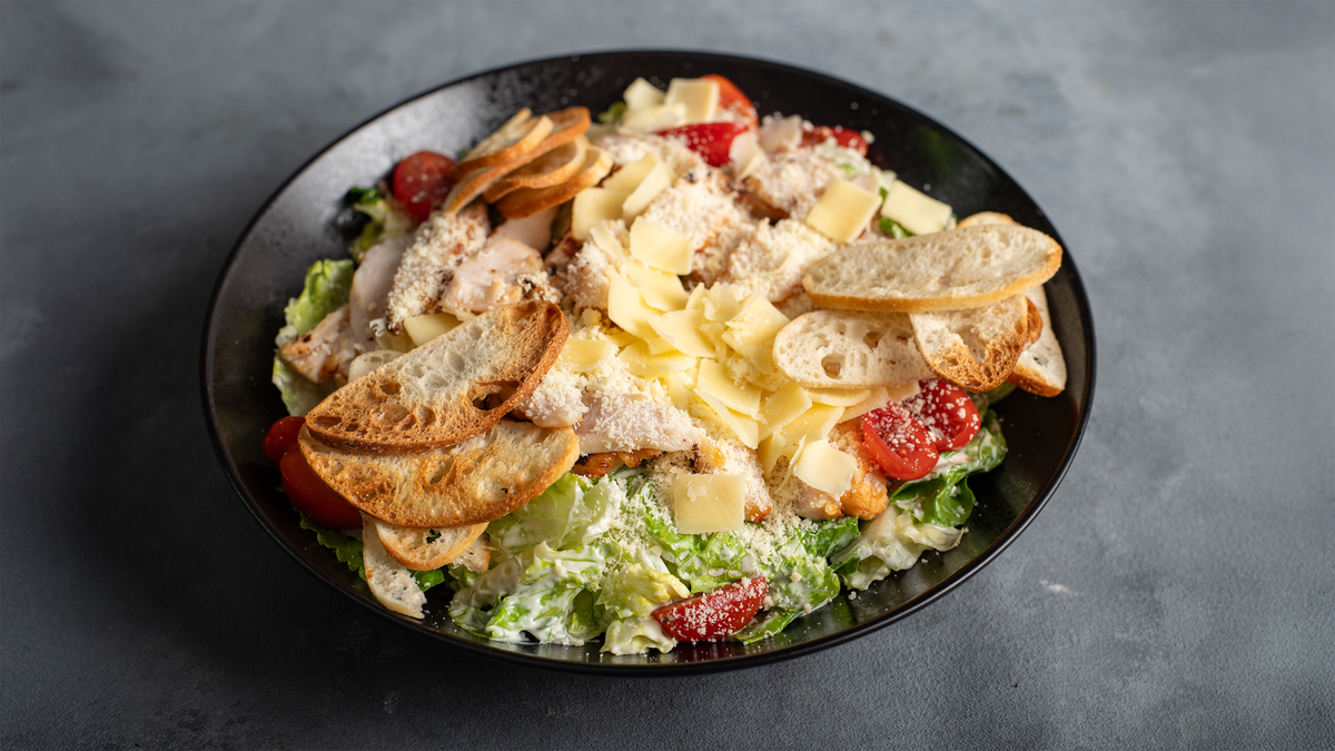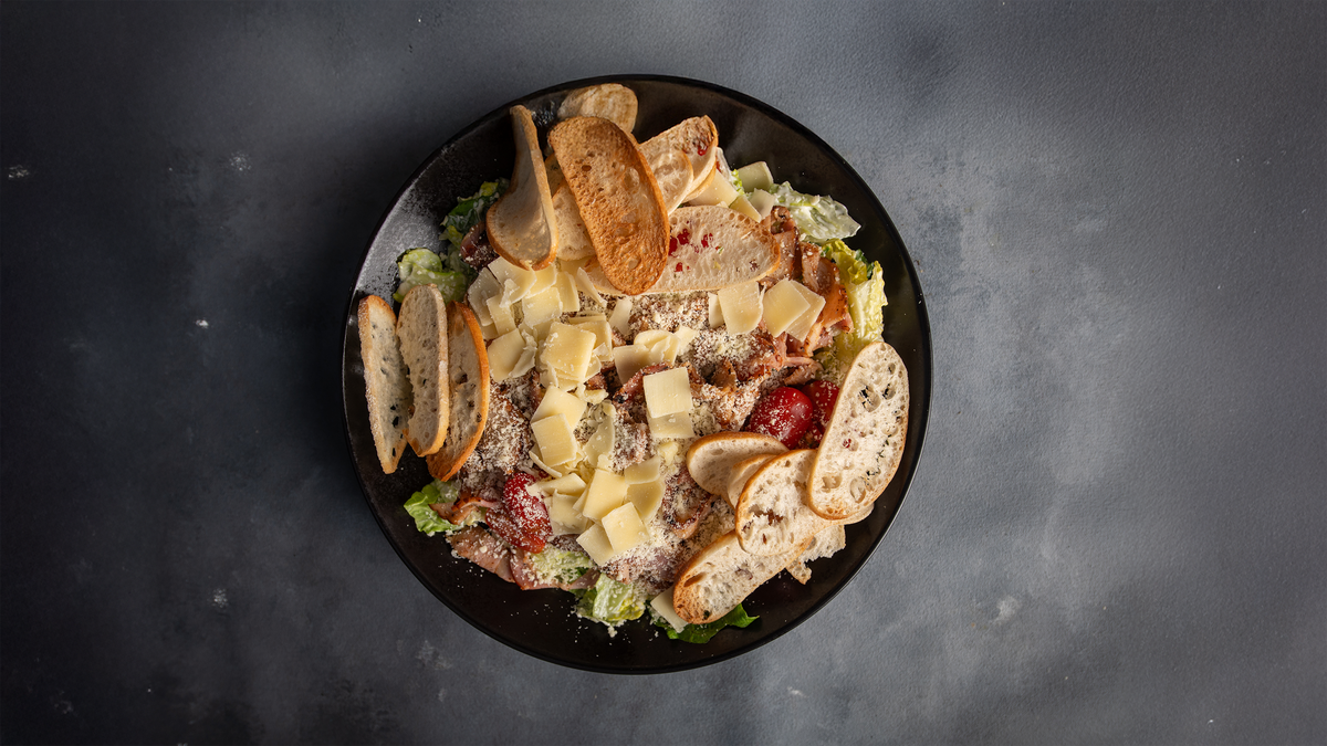Romiešu salāti, pašmāju cēzara mērce, grilēta vistas fileja, grauzdiņi, parmezāna siers