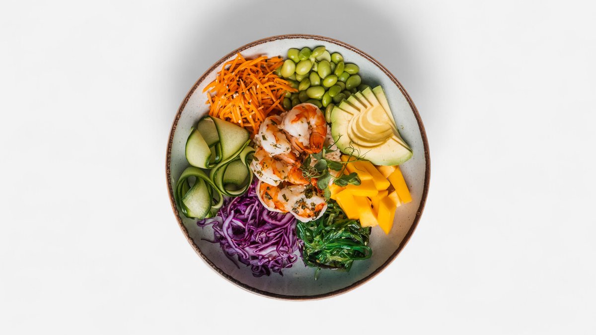 Tīģergarneles, sojas pupas, marinēts burkāns, avokado, jūras zāle, sarkanais kāposts, svaigais gurķis, basmati rīsi, sezama sēklas
