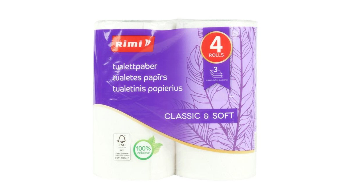 Tualetes papīrs Rimi 145 sloksnes, 3 slāņi, 4 ruļļi