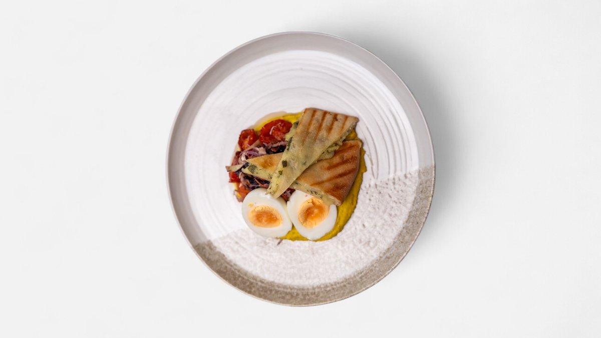 Humuss ar olu, zaļumu plāceni, ''coleslaw'' salātiem un kraukšķīgu bekonu.