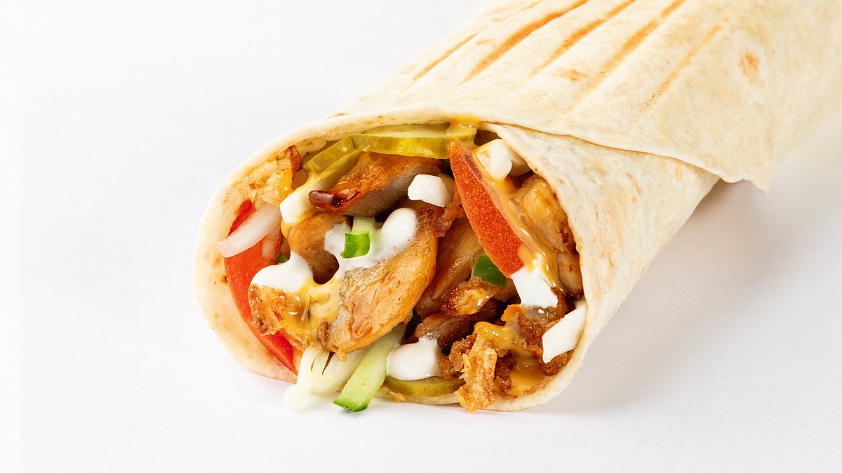 Lavašs, vistas gaļa, kāpostu salāti, tomāti, cepti sīpoli, marinēti gurķi, baltā mērce, sinepju mērce