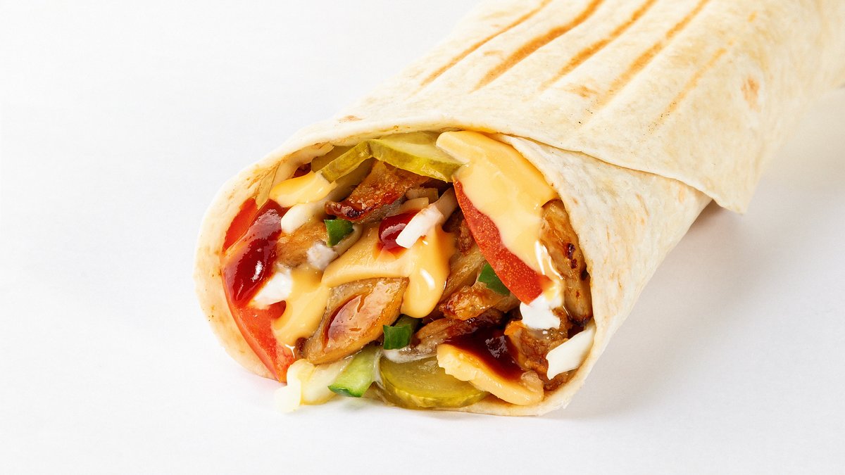 Lavašs, vistas gaļa, čedaras siers, kāpostu salāti, gurķi, tomāti, marinēti gurķi, baltā mērce, siera mērce, BBQ mērce