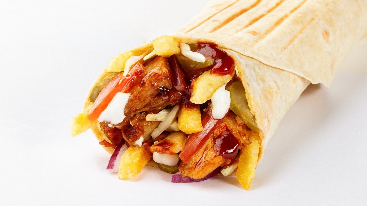 Lavašs, vistas gaļa, frī kartupeļi, kāpostu salāti, tomāti, marinēti gurķi, sarkanie sīpoli, baltā mērce, BBQ mērce
