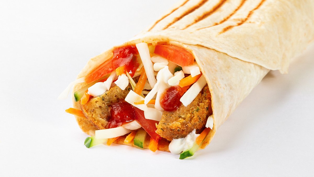Lavašs, falafels, kāpostu salāti, gurķi, tomāti, korejiešu burkāni, baltā mērce, tomātu mērce