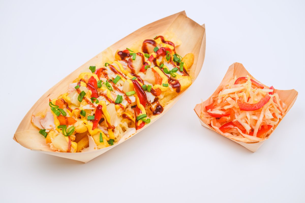 Frī kartupeļi, siers, vista, marinēta paprika, ananāsi, karija mērce, BBQ mērce, zaļie lociņi, kāpostu salāti