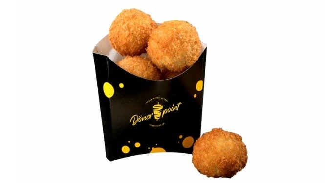 Frī kartupeļi, vistas gaļa, kāpostu salāti, tomāti, gurķi, marinēti gurķi, sarkanie sīpoli, baltā mērce, tomātu mērce