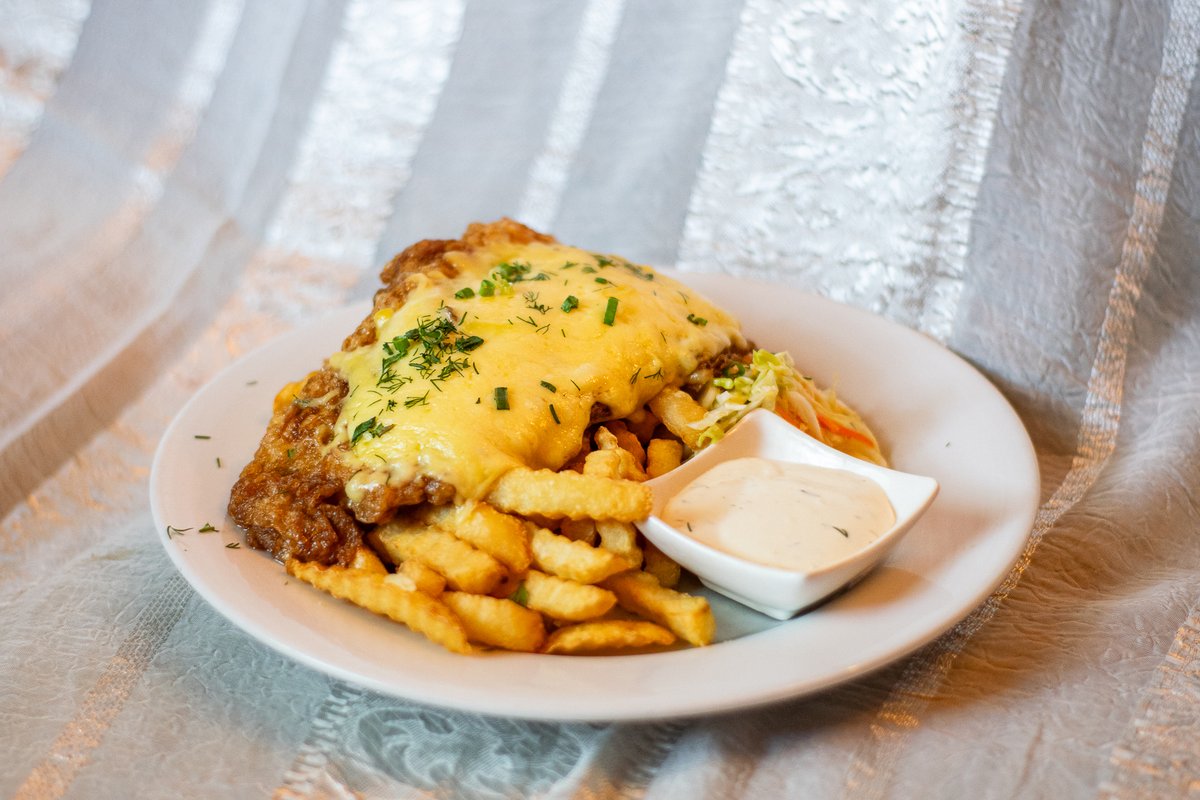 Vistas karbonāde ar siera cepurīti kopā ar frī kartupeļiem un ķiploka mērci
