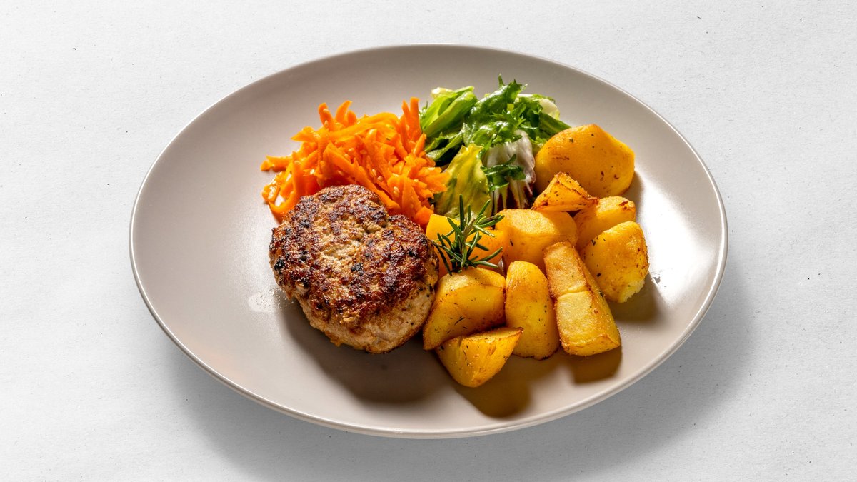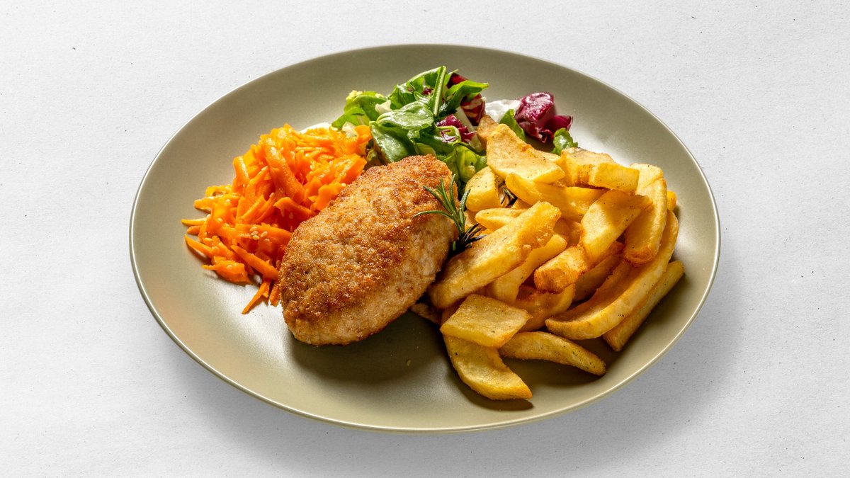Vistas gaļas nageti ar frī kartupeļiem + Cido suliņa. Attēlam ir ilustratīva nozīme.