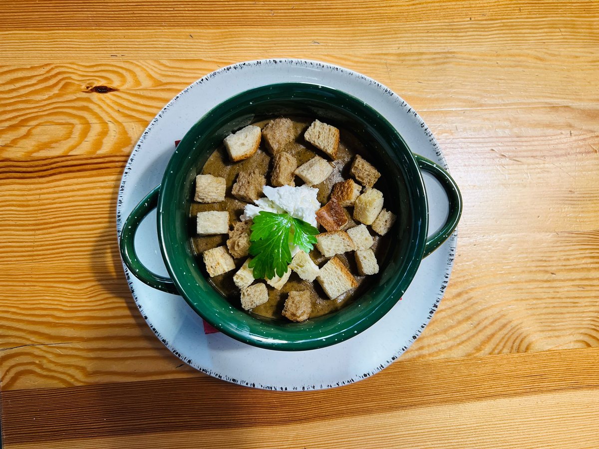Mīksta, krēmīga sēņu zupa, gatavota no svaigām sēnēm, burkāniem, sīpola un kartupeļiem, papildināta ar saldo krējumu.