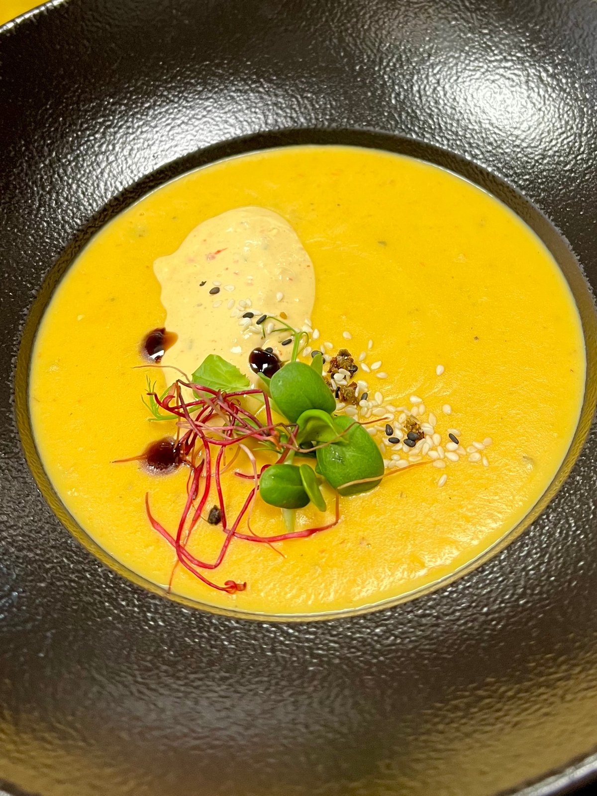 Ķiirbju krēmzupa ar tīģergarnelēm