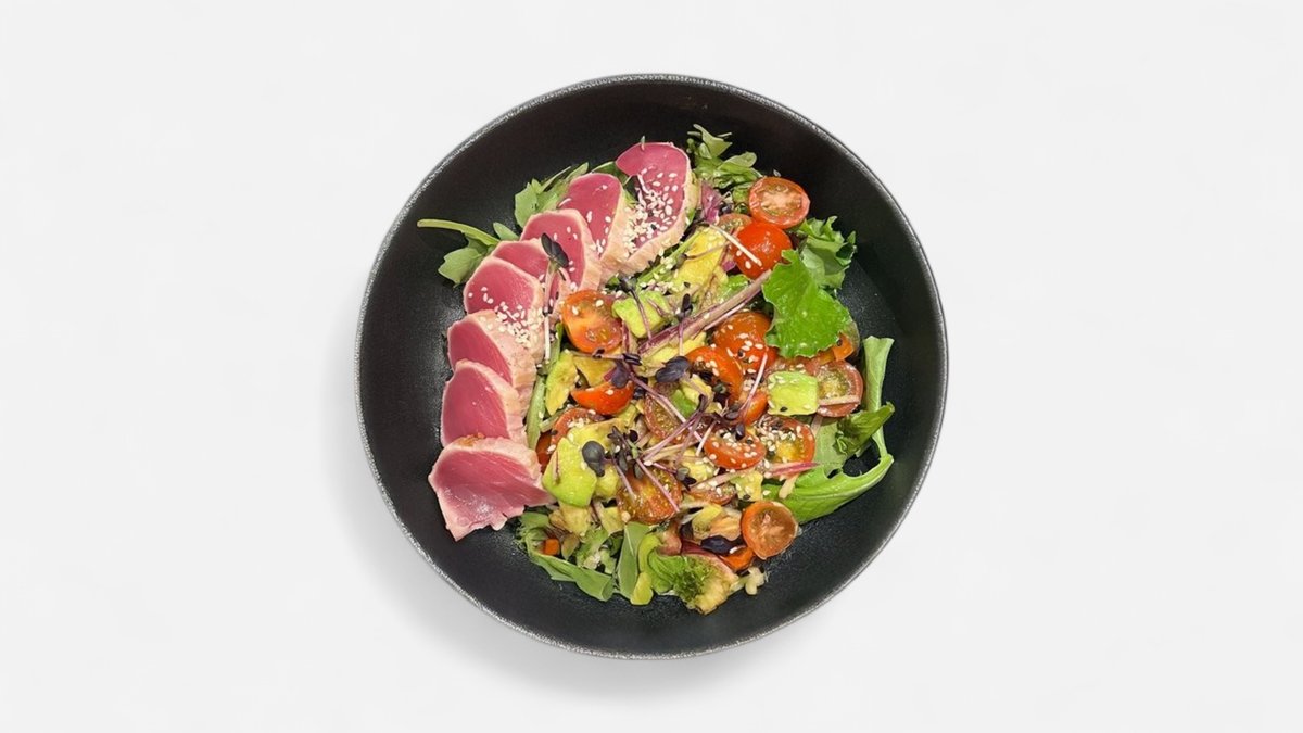 Svilināts tuncis ar ķiršu tomātiem, avokado un svaigiem salātiem