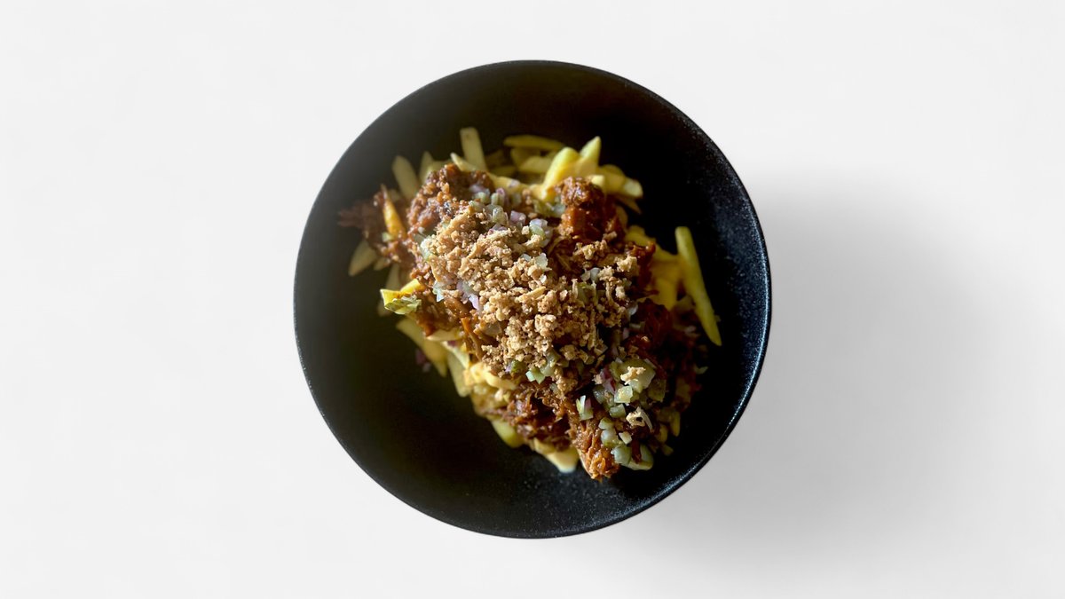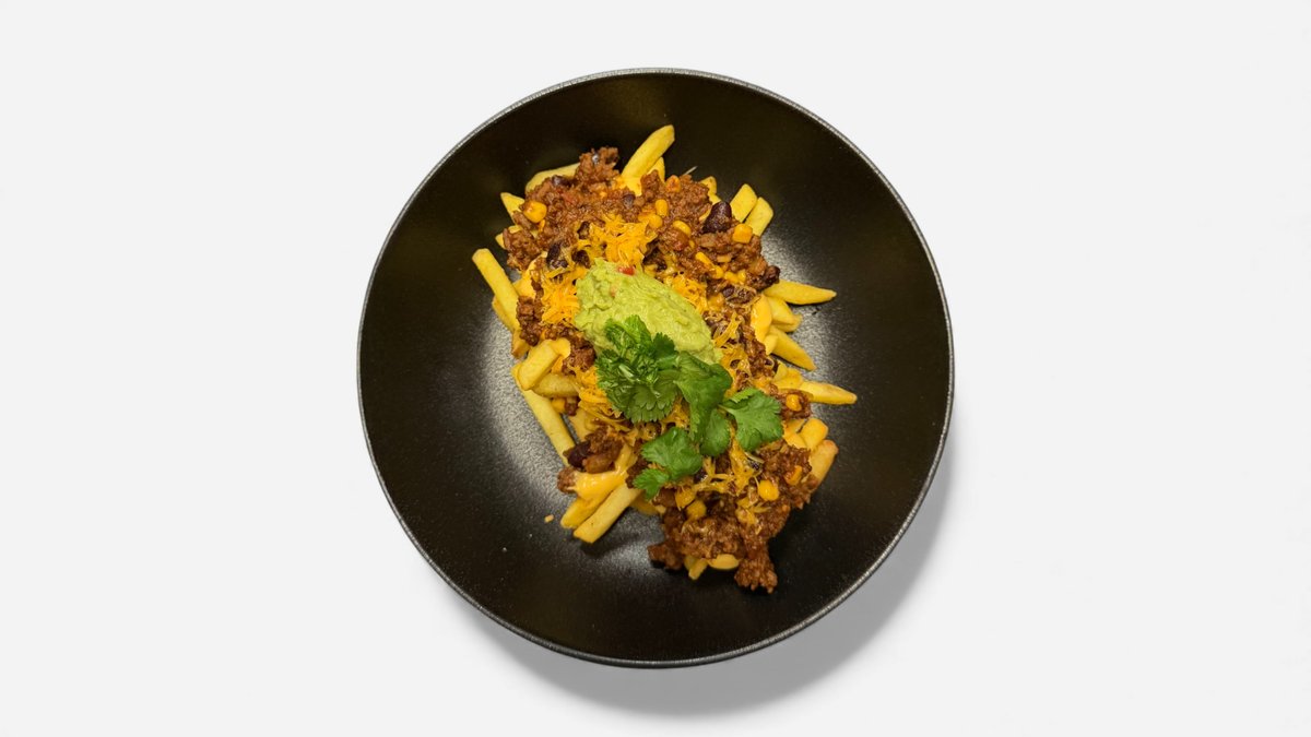 "Netīrie frī" ar maltās gaļas un pupiņu sautējumu