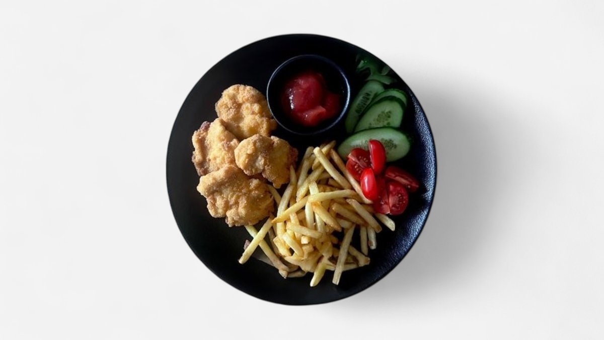 Pašu gatavotas vistas strēmelītes (nageti) ar frī kartupeļiem un tomātu mērci