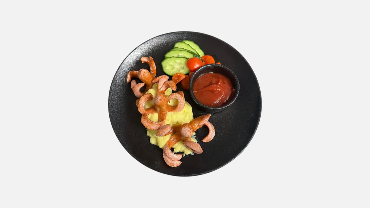 Astoņkājīši (cīsiņi) ar kartupeļu biezeni un tomātu mērci