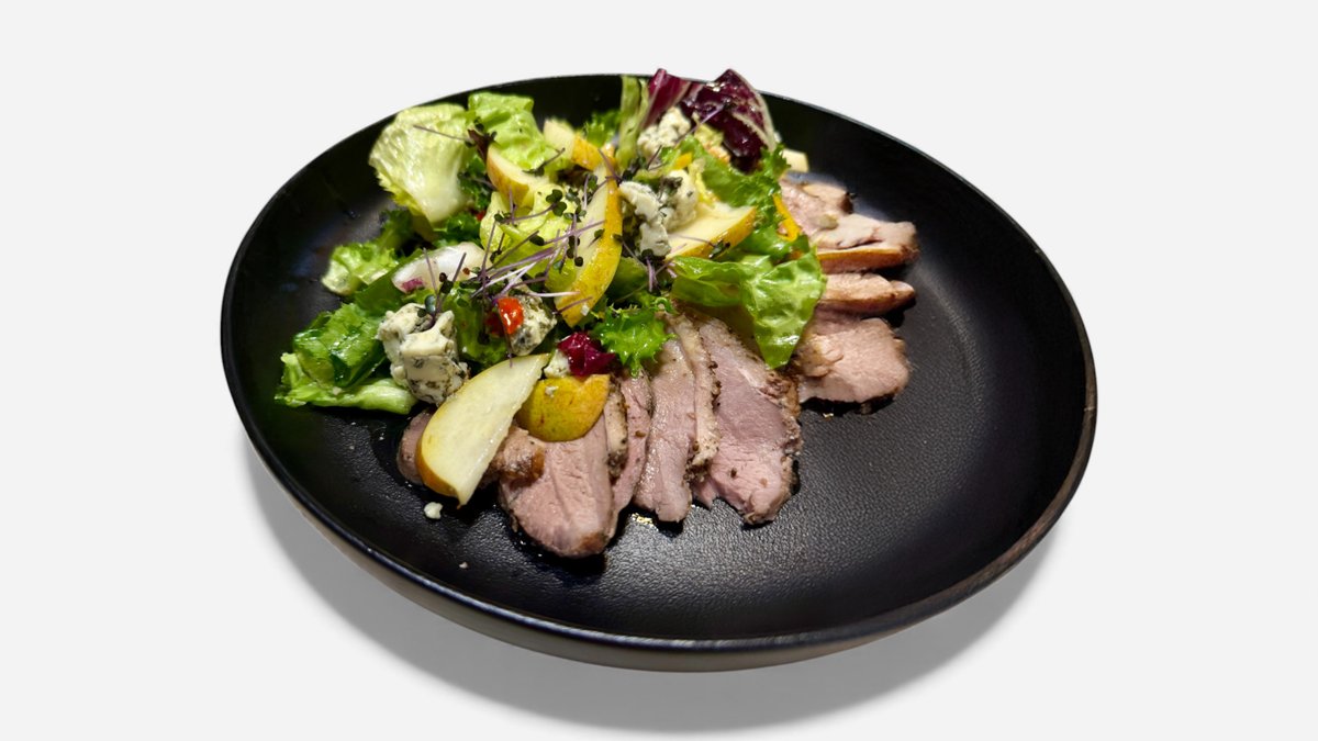 Pīles krūtiņas salāti ar bumbieriem, zilo sieru un valriekstiem