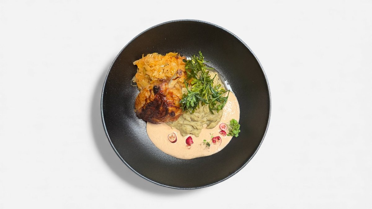 Sivēna stilbiņš ar pelēko zirņu-katupeļu biezeni, štovētiem kāpostiem un mārrutku mērci