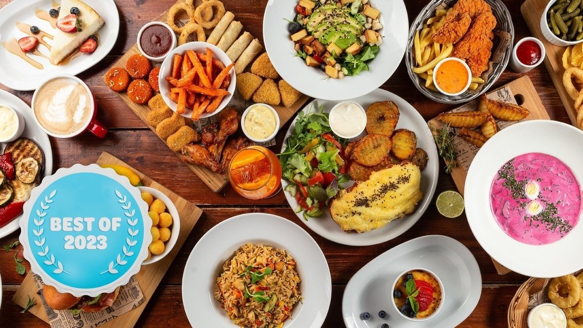 International cuisine menu, featuring a delightful range of options such as poke bowls, wok dishes, burgers, salads, potatoe pacakes.