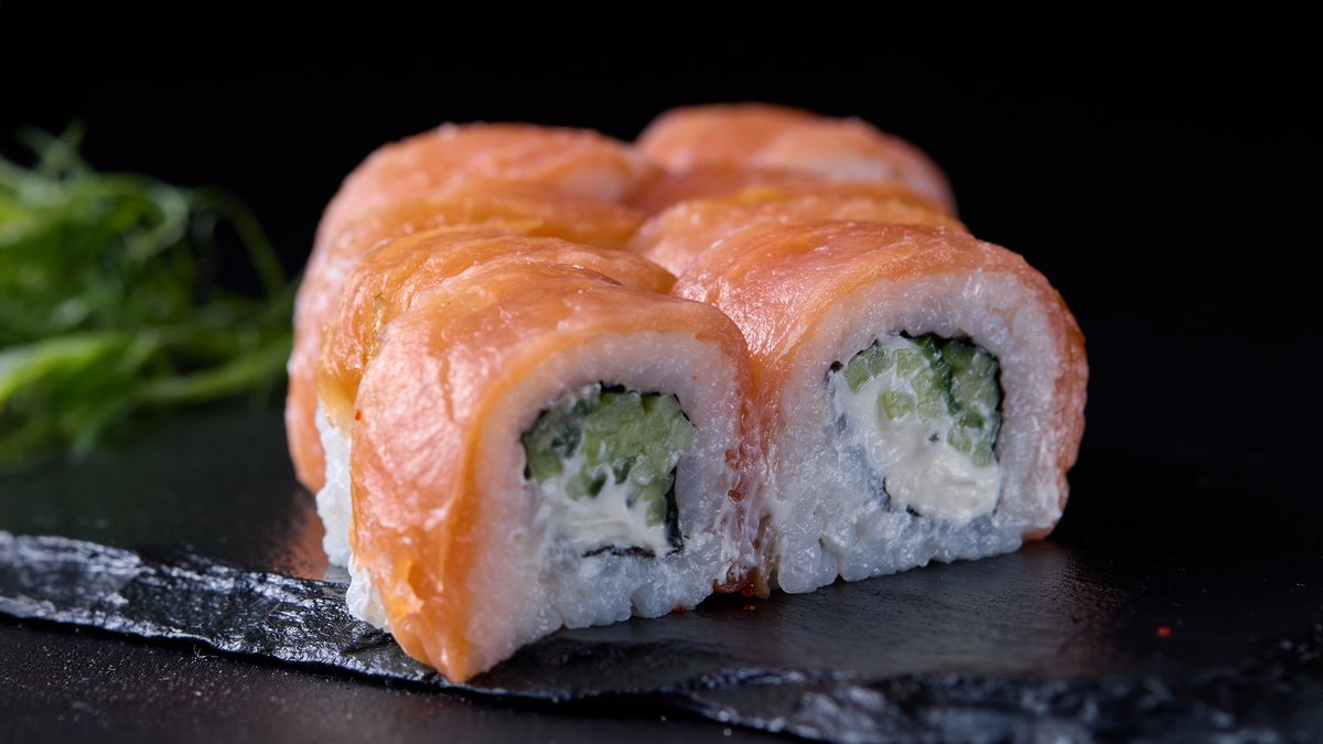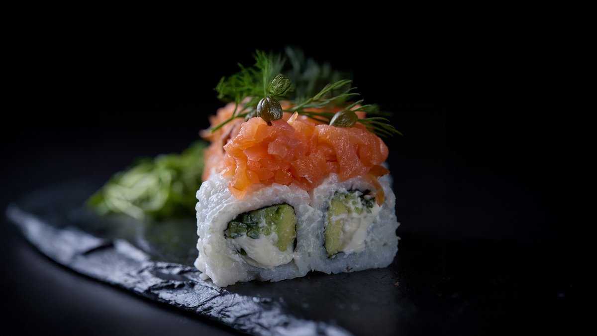 Inside: Cream Cheese, Avocado, Cucumber. Outside: Thinly sliced Smoked Salmon, capers.