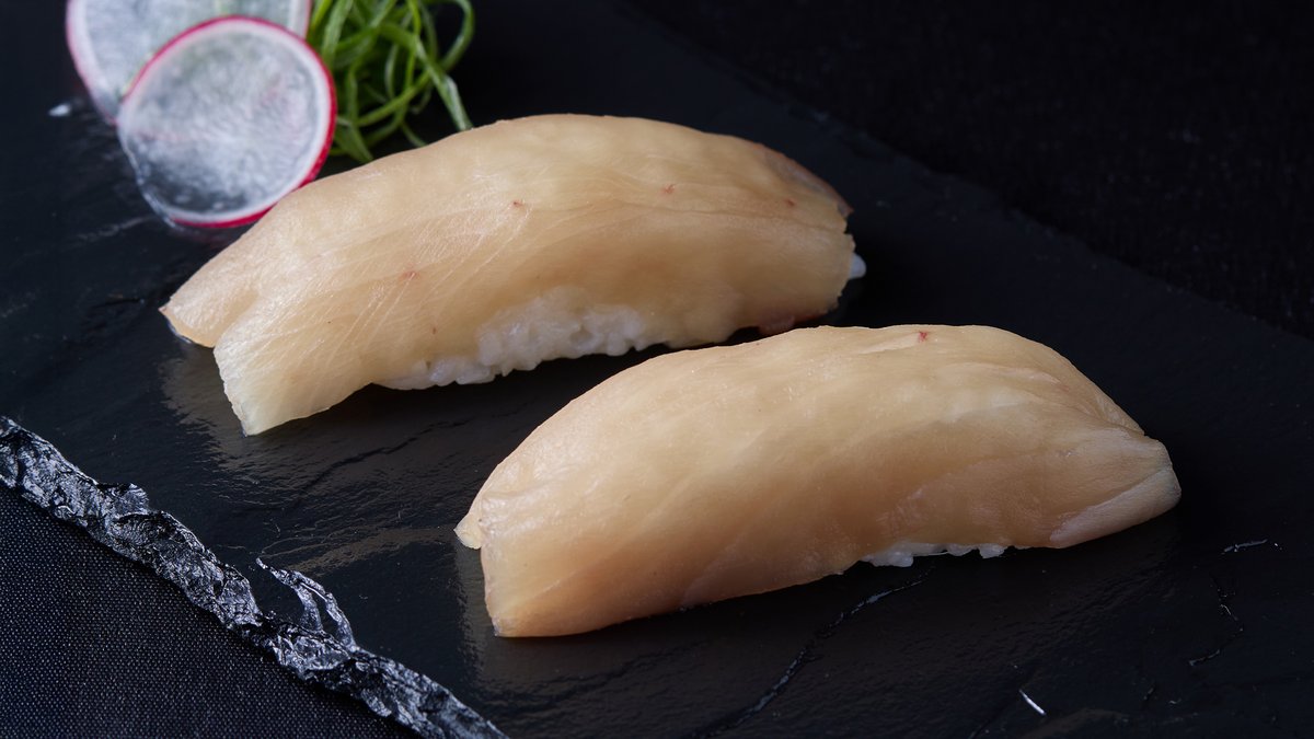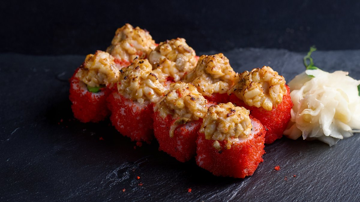 Base: Avocado/Cucumber roll. Top: Baked mix of Seabass, light spicy mayo, Masago