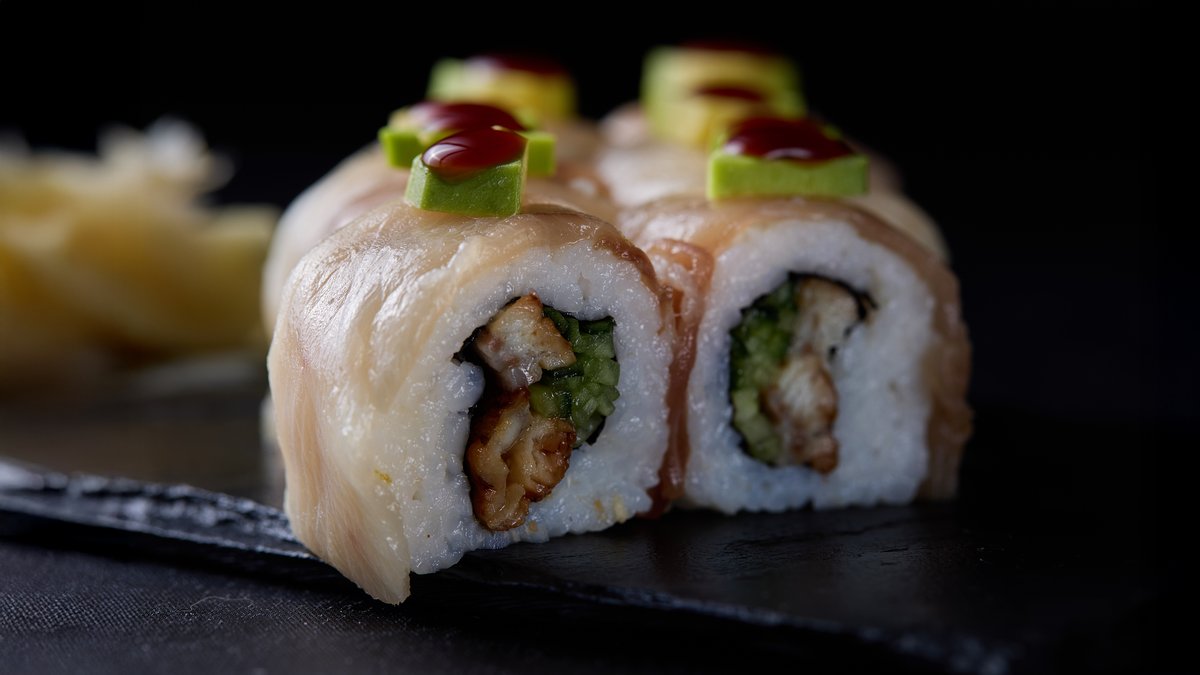 Inside: Eel & Cucumber. Top: Avocado, thin slices of Salmon or Hamachi, minimal Eel sauce.