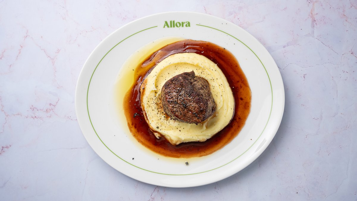 Ar graudiem barota liellopa filejas steiks, kartupeļu biezenis, sarkanvīna mērce