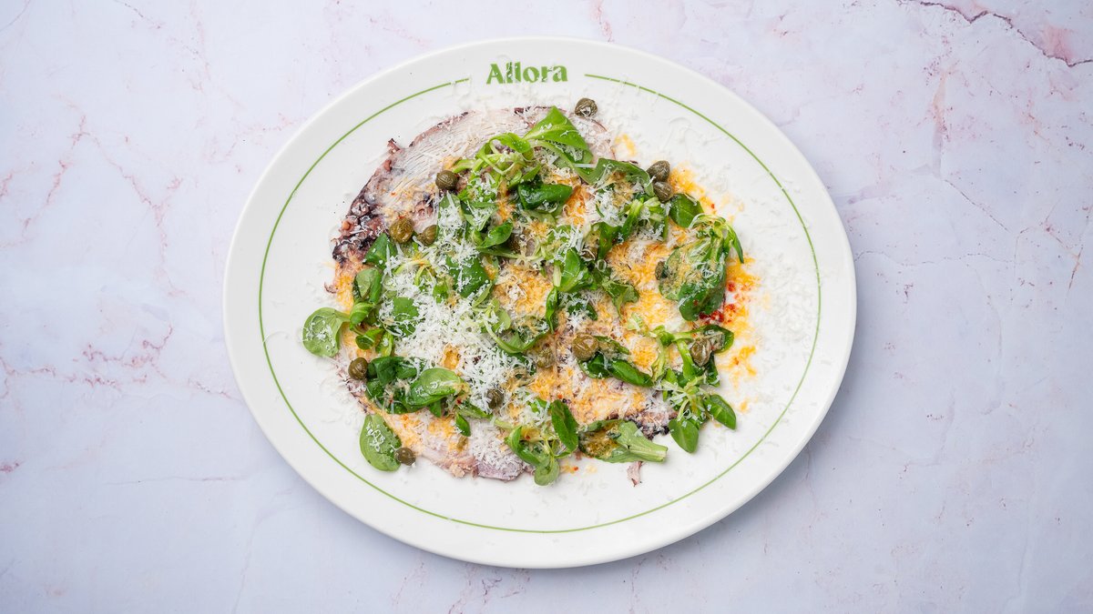 Astoņkāja karpačo, čili-olīveļļas mērce, jēra lapu salāti, parmezāns