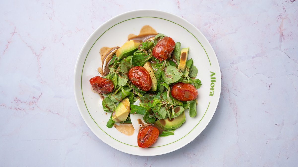 Bufalo mozarella, krāsnī cepti ķiršu tomāti, avokado, jēra lapu salāti, balzamiko mērce, olīveļļa