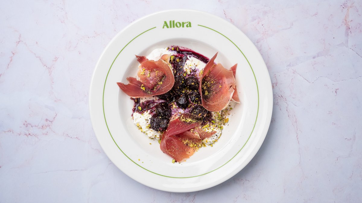Burrata, prosciutto, balzamiko marinētas sarkanās vīnogas, pistācijas